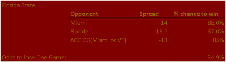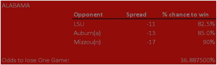 * Pulling spreads from “NCAA games of the year” on sportsbook.ag, and using gambling odds, I’m going to give a rough statistical chance each team loses based on games where they won’t be ~99% favorites