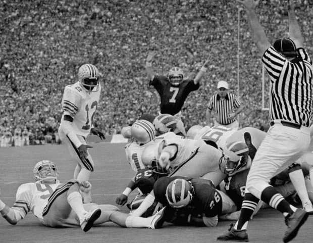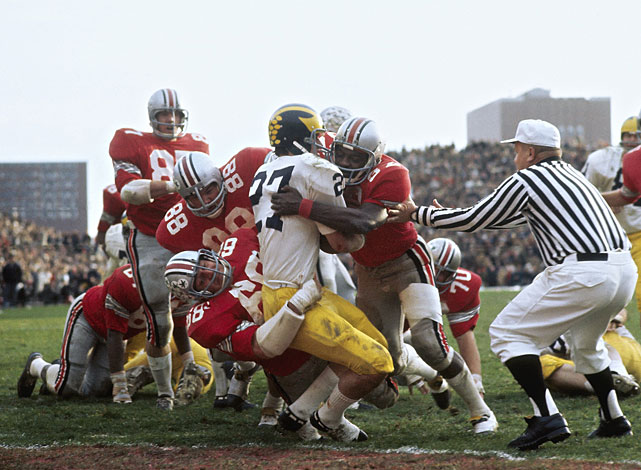 The Game: Michigan came in unbeaten and ranked number 3 and was in the National Title hunt while OSU was struggling at 6-3 with all of the players that had graduated. Despite the fact Michigan came in a heavy favorite and was at home they struggled with OSU. Michigan still won but the game is most remembered for Woody tearing up the down markers at the end of the game when he felt OSU was interfered with late in the game. Michigan would go on to get upset in the Rose Bowl by Stanford and fall out of the title race. (This happened a lot under Bo)