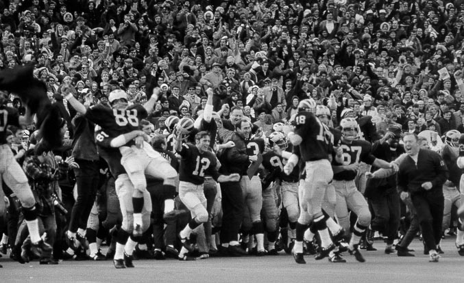 The Game: Once again Michigan came into the Game undefeated while OSU had a controversial loss to Sparty a few weeks prior. (Woody Hayes was pissed and slammed B1G commish Wayne Duke into a locker. Yes that is right, different age man.) The game was in Columbus and Michigan jumped out to a 10-0 lead. OSU was able to chip away with three field goals prior to halftime and took a 12-10 lead in the 3rd Q. Once again the game came down to Michigan’s Mike Lantry’s foot. Once again he missed a late field goal, this time well within his range. Many thought he actually made it but once the refs signaled no good pandemonium took over the Shoe and the fans stormed the field. The lasting image of the game is Lantry by himself at midfield as he is surrounded in a sea of Red